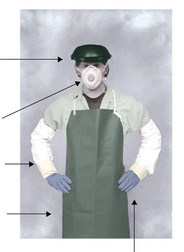 Full front body protection. Rugged PVC apron with nylon backing. Resists most acids, caustics and punctures. Construction features: overlapped and sewn edges with reinforced, heat-sealed vinyl grommets and cotton ties.